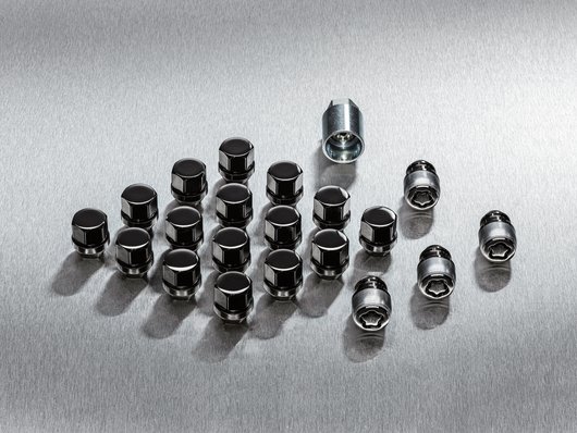 Привабливі легкосплавні колісні диски темного кольору заслуговують на відповідні колісні замки та гайки, які доповнюють їхній стиль. Наші колісні замки та гайки з темного хрому забезпечують надійний захист ваших легкосплавних дисків. Набір з 4 замків і 16 гайок. Ключ входить.